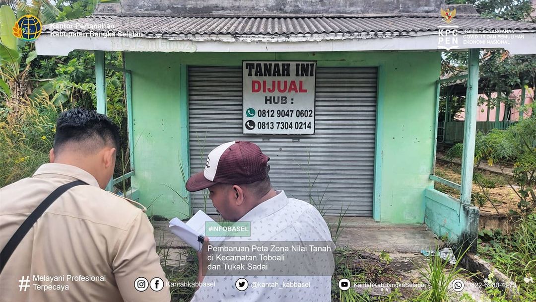 Zona Nilai Tanah adalah poligon yang menggambarkan nilai tanah yang relative sama dari sekumpulan bidang tanah didalamnya, yang batasannya bisa bersifat imajiner ataupun nyata sesuai dengan penggunaan tanah. Kegiatan Pembaharuan Zona Nilai Tanah bertujuan agar informasi nilai tanah selalu terupdate (terbaru) yang dapat dimanfaatkan untk pelayanan pertanahan dan sebagai referensi kebijakan yang berkaitan dengan nilai tanah. - Di KAB Bogor desa/kel yang sudah di data untuk kegiatan Pembaruan Peta Zona Nilai Tanah adalah sebagai berikut : kelurahan toboali, kelurahan tanjung ketapang, kelurahan teladan, desa gadung, desa rias, desa serdang, desa pasir putih, desa keposang, dan desa Tukak sadai