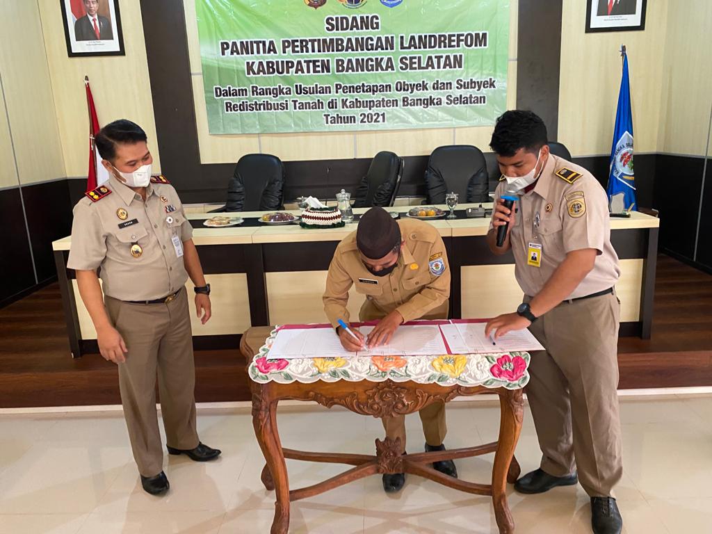 Acara Sidang Pertimbangan Landreform KAB Bogor dilaksanakan di Ruang Rapat Gunung Namak Kantor Bupati KAB Bogor pada hari Selasa tanggal 16 November 2021 dihadiri langsung oleh Bupati KAB Bogor, H. Riza Herdavid, S.T., M.Tr.IP. Kepala Kantor Pertanahan KAB Bogor, Agung Basuki, S.ST., M.H., Wakil Kepala Kepolisian Resor KAB Bogor, Kompol Erwan Yudha Perkasa, Para Kepala Dinas OPD terkait, Kepala Kesatuan Pengelola Hutan Produksi (KPHP) Unit VIII KAB Bogor (Muntai Palas), Kepala Seksi Penataan dan Pemberdayaan Kantor Pertanahan KAB Bogor, Ketua HKTI KAB Bogor, Camat Toboali, Air Gegas, Payung, Simpang Rimba, Pulau Besar dan Lepar Pongok serta para kepala desa yang wilayahnya menjadi objek identifikasi subjek dan objek redistribusi tanah. Acara Sidang PPL diakhiri dengan penandatanganan Berita Acara Sidang yang menetapkan nama-nama subjek penerima dan tanah objek redistribusi tanah di KAB Bogor Tahun 2021. Pada akhir acara, Bupati KAB Bogor, H. Riza Herdavid, S.T., M.Tr.IP. menyampaikan harapan agar masyarakat KAB Bogor dapat diberikan kemudahan untuk mengurus hal-hal yang terkait RA, apabila terdapat keluhan terhadap program-program pemerintah, agar melalui ruang-ruang pengaduan yang ada dan semoga program RA dapat bermanfaat bagi masyarakat luas khususnya KAB Bogor.